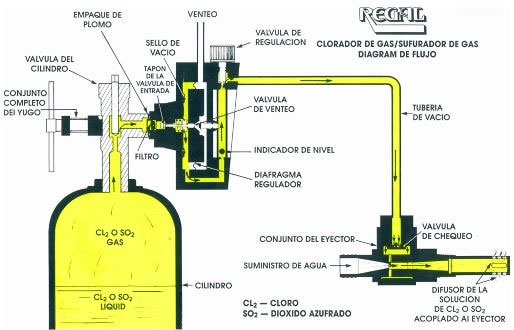 Los sistemas de cloración REGAL, de montaje directo y 100% vacio, eliminan la necesidad de mangueras a presión, válvulas y conexiones. La ruptura accidental de las mangueras de vacío, o daños físicos en el clorador detienen de inmediato el flujo de cloro, en la válvula del cilindro.